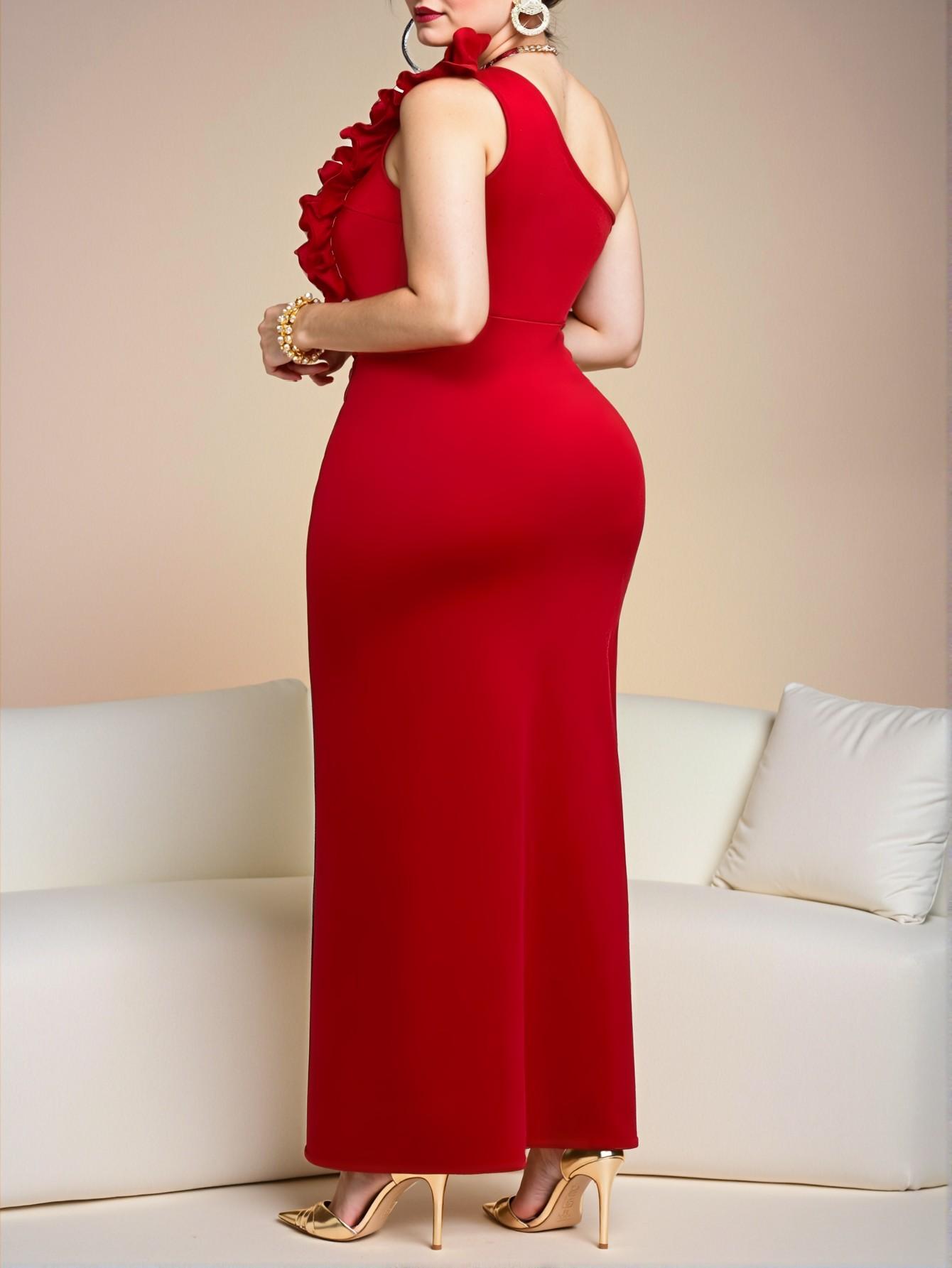 This Elegant Red Asymmetrical Shoulder Ruffle Trim Ruched Design Sleeveless Dress is the perfect choice for your parties, dates, and formal events. With its chic and classy silhouette, this stunning dress is designed to impress. Featuring a trendy asymmetrical neckline and exquisite ruffle detailing, this fitted piece flatters your figure beautifully. Made with high stretch knitted fabric, it ensures comfort without compromising style. Embrace elegance and leave a lasting impression wherever you go in this stunningly crafted long dress.